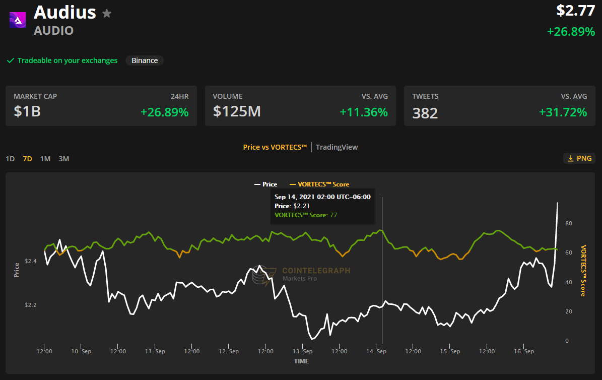 如上图所示,AUDIO 的 VORTECS™ 分数在过去一周的大部分时间里都处于绿色状态,并在 9 月 14 日达到 77 的高位,大约在第二天价格上涨 38% 之前的 22 小时。