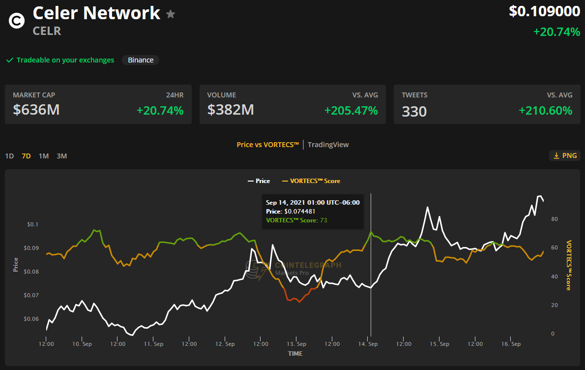 来自 Cointelegraph Markets Pro 的 VORTECS™ 数据于 9 月 14 日开始检测到 CELR 的看涨前景,在最近的价格上涨之前。