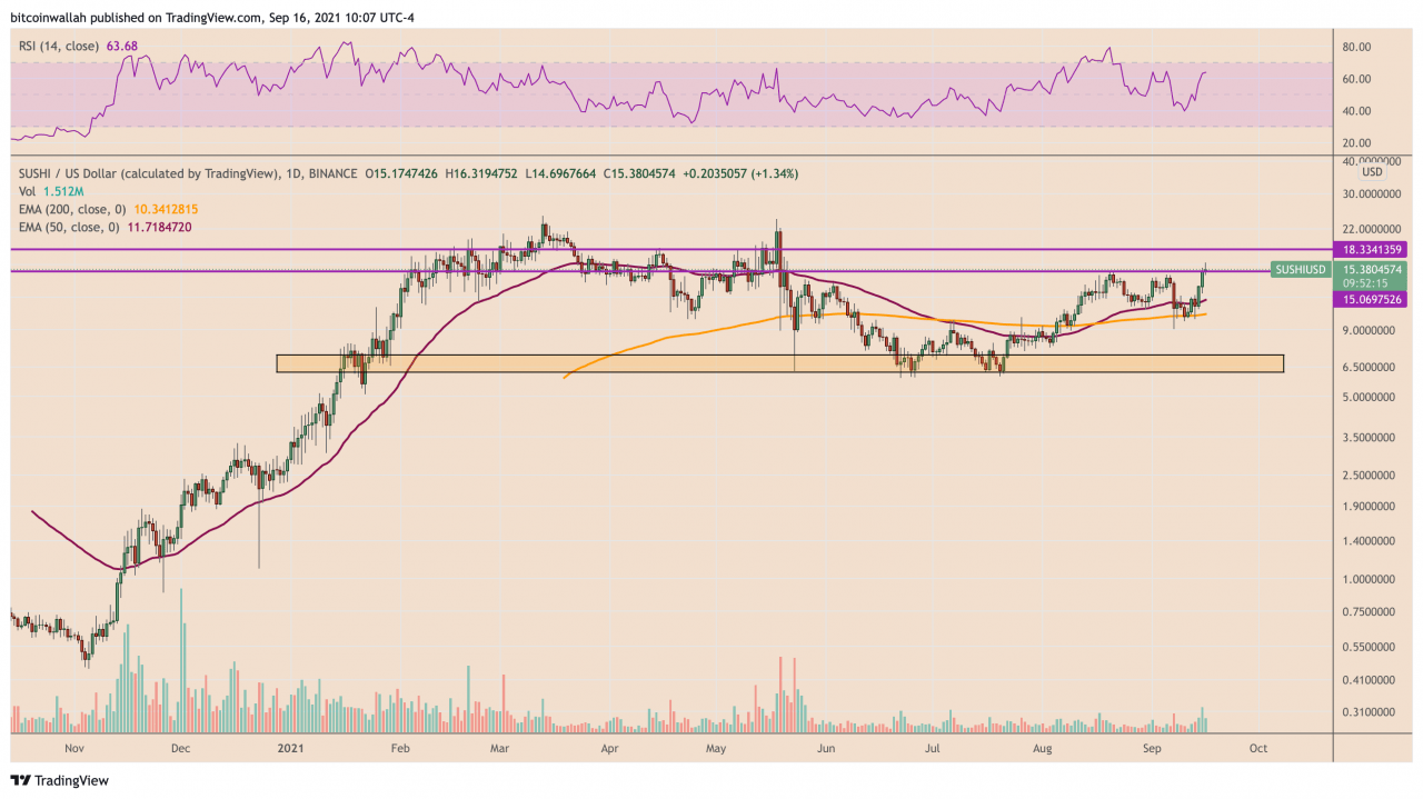SushiSwap (SUSHI) 价格在去中心化交易所 (DEX) 代币又上涨一天后于 9 月 16 日攀升。