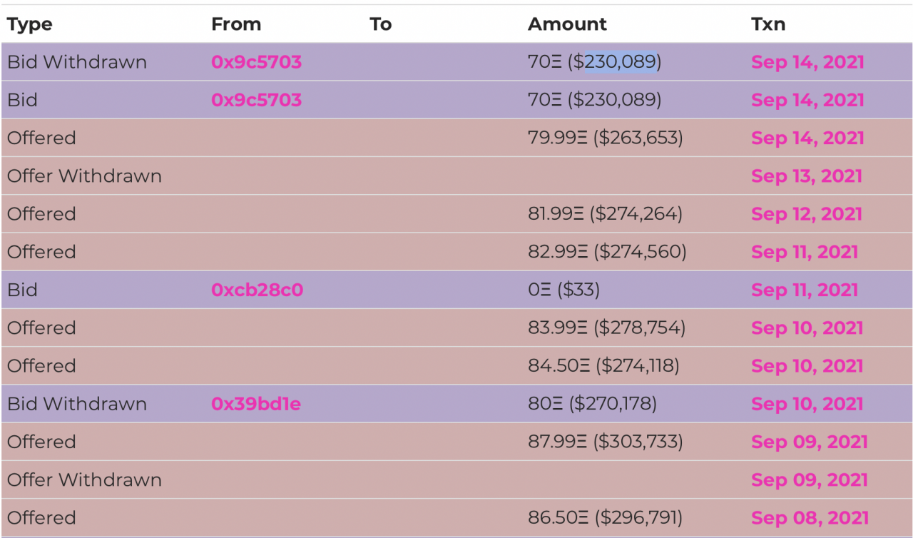 但是,#1417 没有出价,迫使拍卖师在 9 月 7 日之前将 NFT 的底价降低到 93.99 ETH(368,539 美元)。之后的一系列讨价还价,所有者以 79.99 ETH 的价格上架了数字收藏品,并收到了 70 ETH 的报价(230,089 美元)。