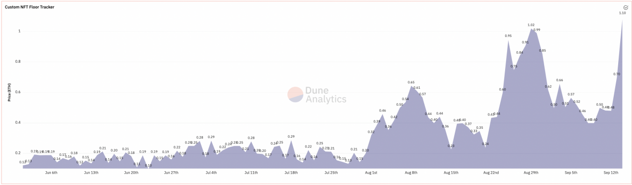尽管如此,9 月 14 日,平均价格飙升至 1.10 ETH 的历史新高。 值得注意的是,由于新的 NFT项目以更高的要价推出,价格下限可能会上涨。 但对于该领域的顶级玩家,例如 CryptoPunks,价格下限仍然较低。