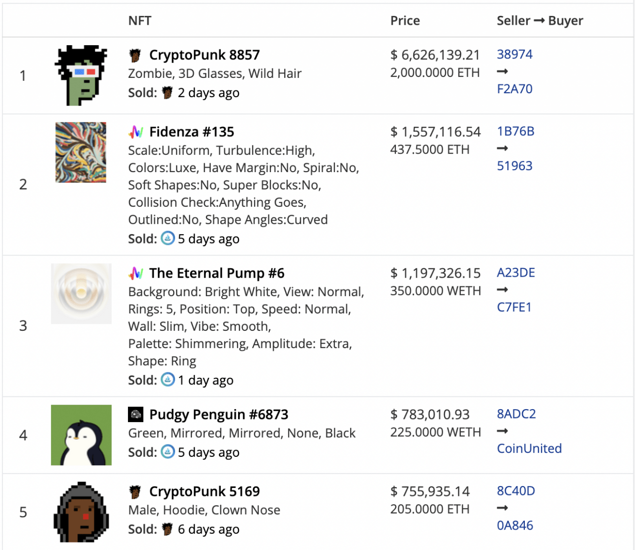 同时,也发生了过去7天的多起高价CryptoPunks NFT销售。 例如,9 月 12 日,Zombie“CryptoPunk 8857”收到了价值 662 万美元的 2,000 ETH 出价。 同样,上周,小丑鼻子的“CryptoPunk 5169”以 205 ETH(约合 755,935 美元)的价格售出。