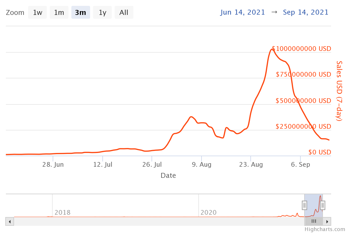 具体来说,在 8 月底达到顶峰后,NFT 市场见证了价值 8655 万美元的交易,所有交易都涉及 CryptoPunks 头像的销售。 这一趋势在 9 月的前两天进一步持续,但在接下来的几个交易日中出现了急剧下跌。