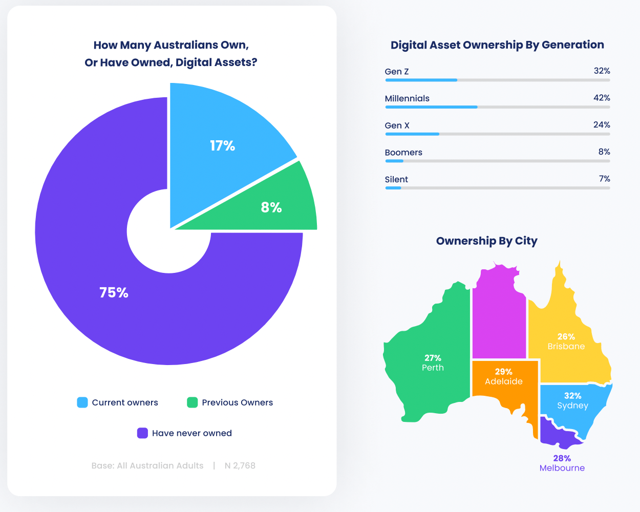 8 月份的 Finder 调查声称,17% 的澳大利亚人至少拥有一种加密货币——9% 拥有比特币,8% 拥有以太币,5% 拥有狗狗币。