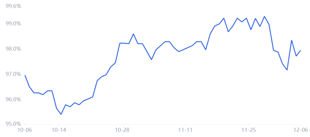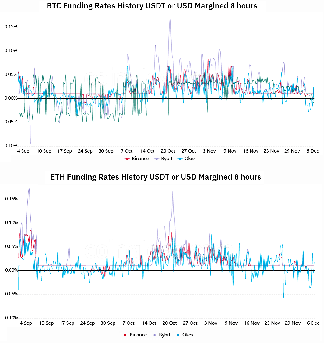 数据显示,随着 8 小时融资利率降至零以下,12 月 3 日和 4 日出现了温和的看跌趋势。 负资金利率表明空头(卖方)是支付费用的人,但一旦 BTC 和 ETH 价格从低点反弹 15%,这种运动就消退了。