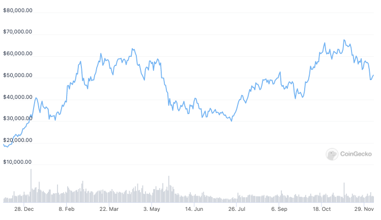 根据 CoinGecko 的数据,在撰写本文时,比特币的交易价格为 51,290 美元,在 12 月 4 日跌破 47,000 美元后明显回升。 在 2021 年以 30,000 美元左右开始之后,比特币在 11 月中旬创下了 67,000 美元以上的历史新高。
