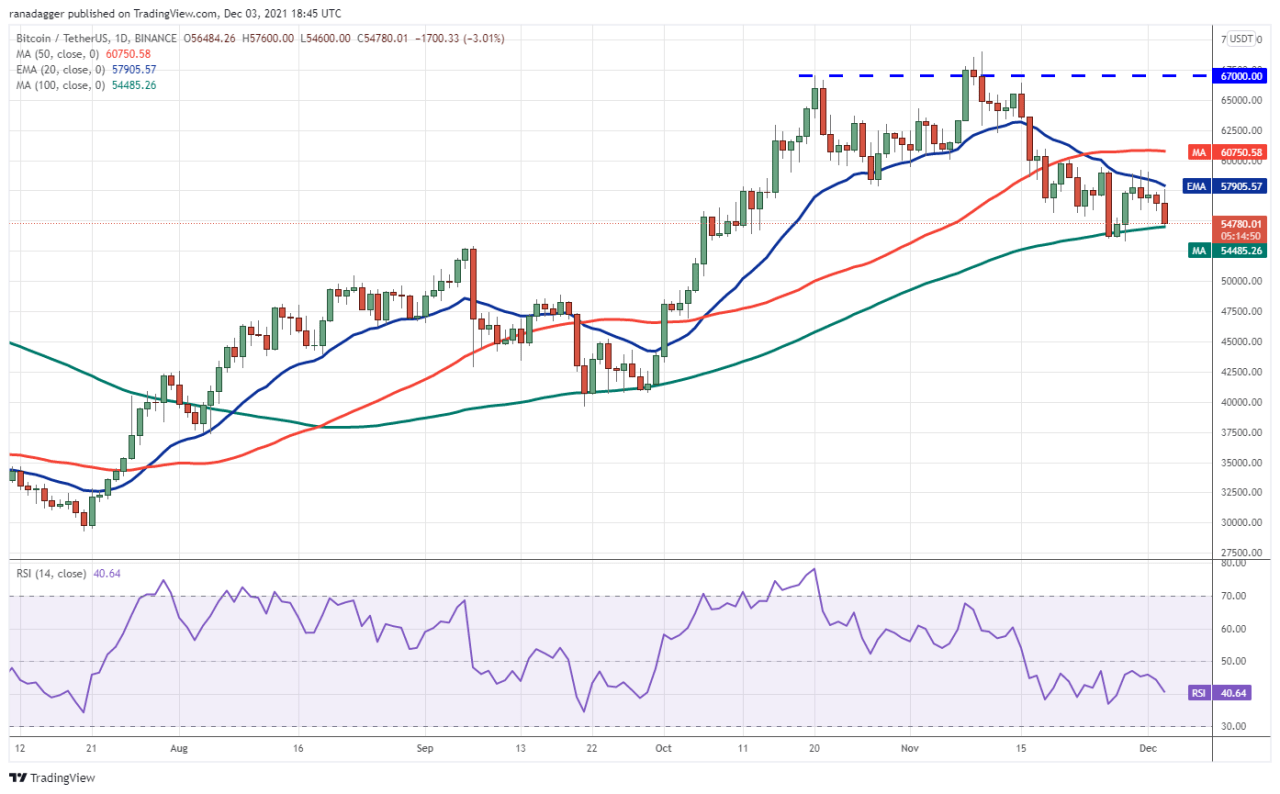 空头现在将试图将价格下沉并维持在 100 天简单移动平均线(SMA)(54,485 美元)和 11 月 28 日盘中低点 53,256.64 美元下方。 如果他们成功,BTC/USDT 对可能会跌至 50,000 美元的关键心理支撑位。