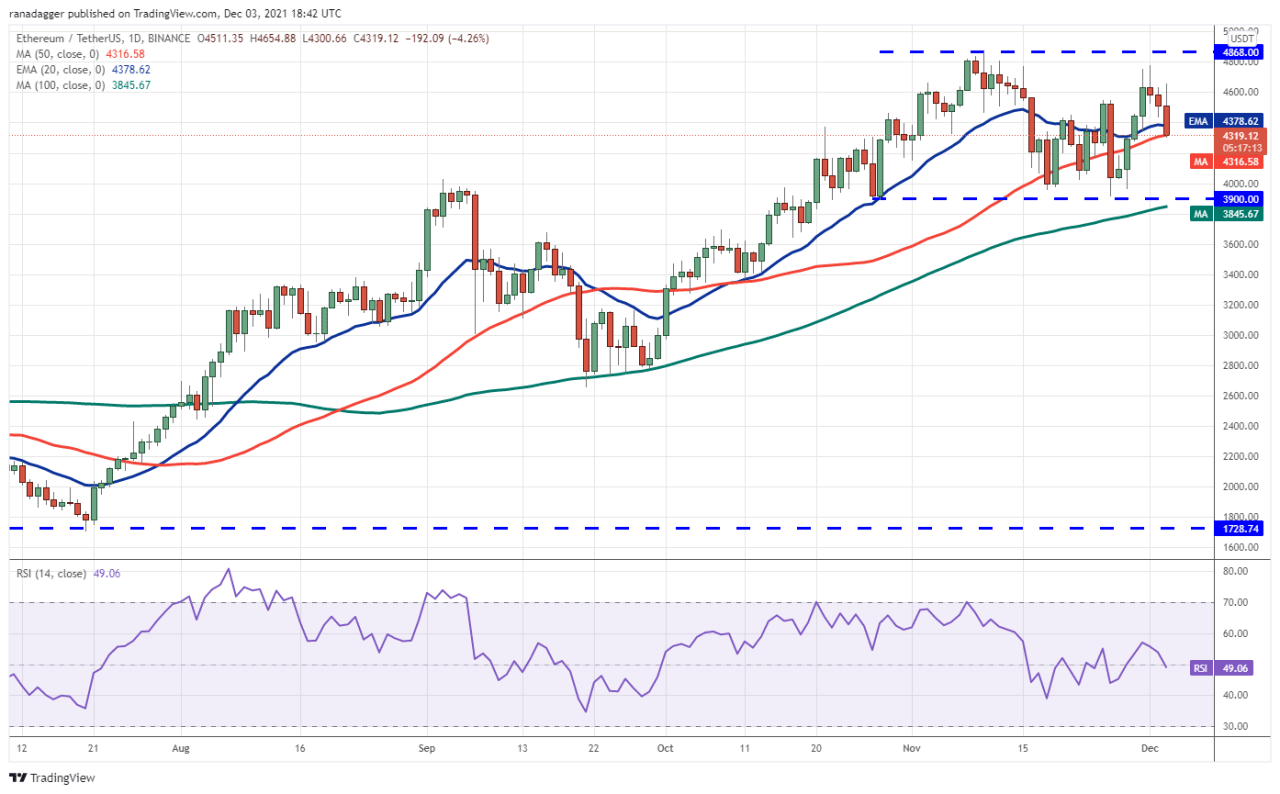 以太币从 12 月 1 日的 4,778.75 美元回落,表明空头正在积极捍卫历史高点 4,868 美元。 价格在 12 月 3 日回落至 50 日均线(4,319 美元)。