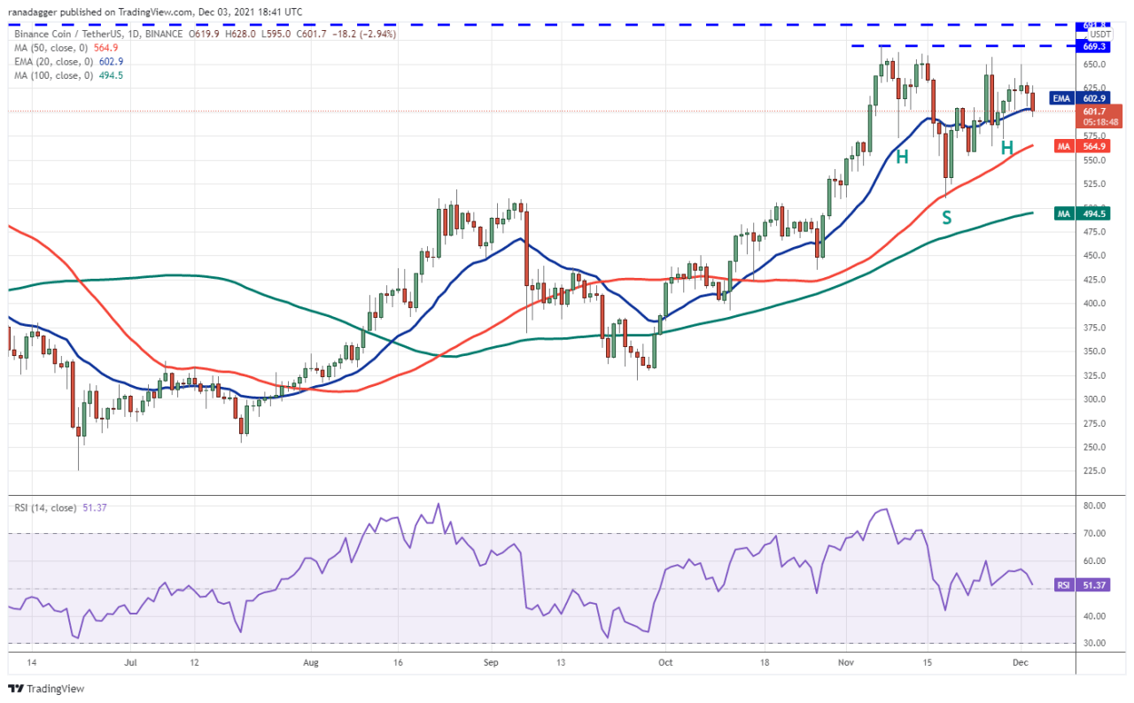 如果价格跌破 20 日均线,则 BNB/USDT 对可能跌至 50 日均线(564 美元)。 这是多头要捍卫的重要水平,因为跌破该水平可能会将价格拉低至 100 天均线(494 美元)。