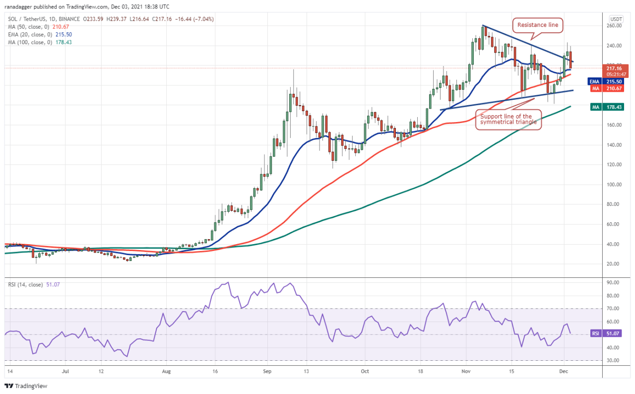 Solana (SOL) 在 12 月 1 日突破并收于对称三角形的阻力线上方,但多头无法维持更高的水平。 空头在 12 月 3 日将价格拉回三角形。