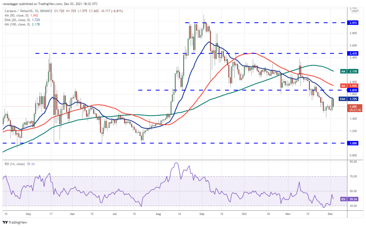 卡尔达诺(ADA)在 12 月 2 日大幅回升,但在 20 天均线(1.72 美元)处碰壁。 多头未能清除头顶障碍可能吸引了空头的大量抛售。