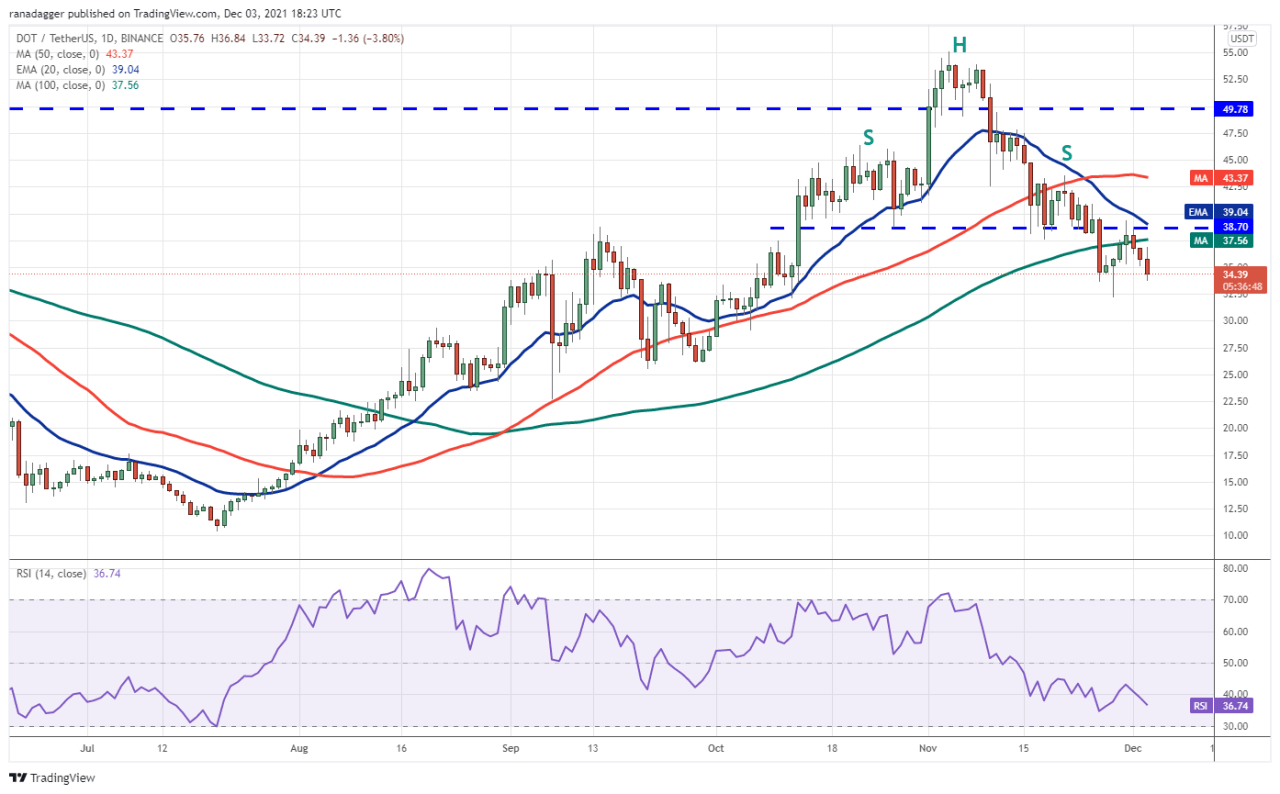 Polkadot(DOT)从 11 月 30 日 H&S 模式的击穿水平 38.70 美元回落并跌破 100 日均线(37 美元)。 空头现在试图将价格拉至 32.21 美元的强劲支撑位。