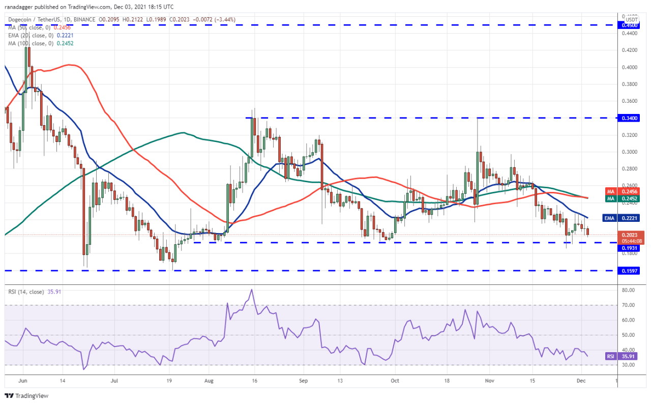 在过去的几天里,多头多次未能将狗狗币(DOGE)推高至 20 天均线(0.22 美元)上方,这表明市场情绪仍然消极,空头正在逢高抛售。