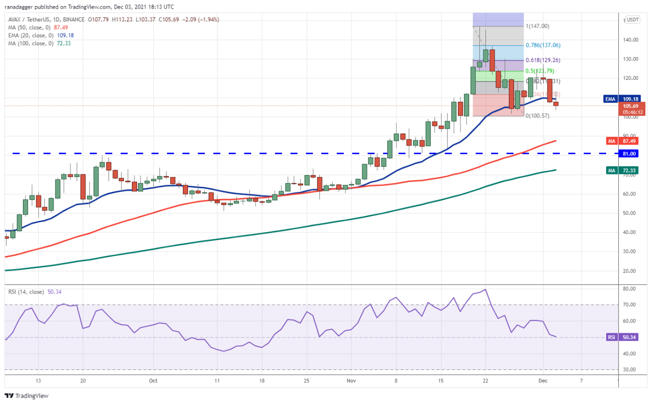Avalanche (AVAX) 在 12 月 1 日从 61.8% 的斐波纳契回撤位回落至 129.26 美元。这可能促使交易员进行获利了结,从而在 12 月 2 日将价格拉低至 20 天均线(109 美元)下方。