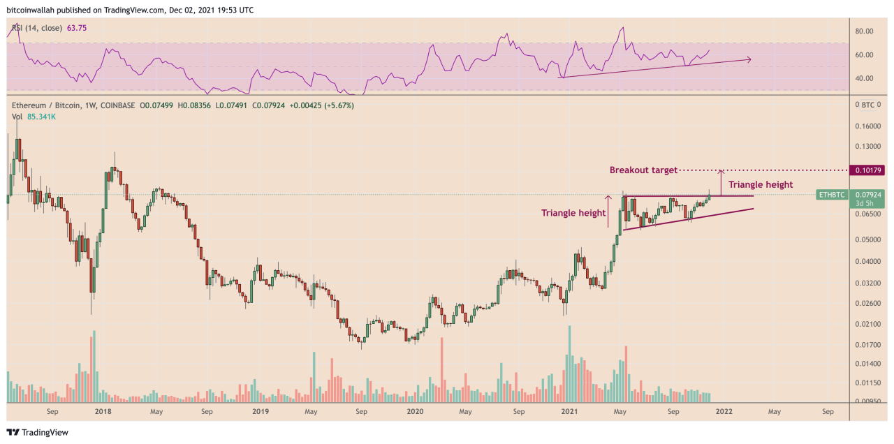 具有上涨三角形设置的 ETH/BTC 每周价格K线走势图。 资料来源:TradingView