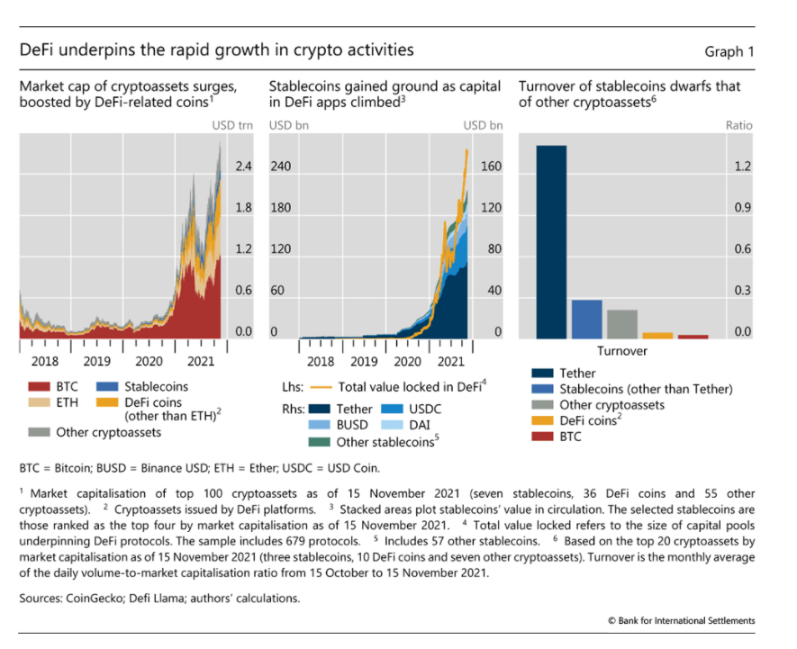 该报告批评了来自 DeFi 交易和借贷平台的高杠杆,例如 币安的保证金一度超过 100 倍。 它还概述了稳定币的脆弱性,其特点是不透明和缺乏监管,再加上流动性问题和市场风险,可能导致投资者的银行挤兑,导致它们在短时间内远低于面值。