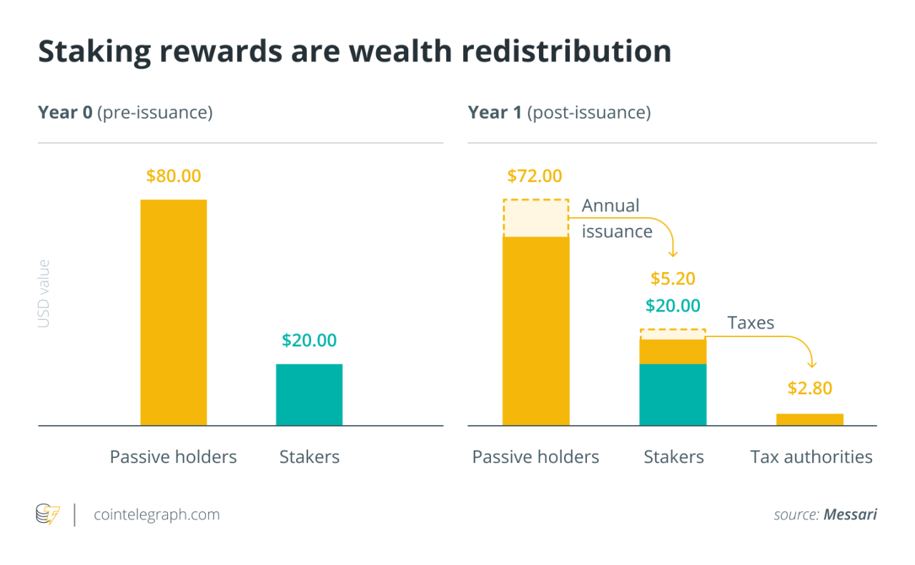 对于 PoS 代币投资者而言,错失 Staking 收益不仅仅是错失良机——它会导致持有高通胀资产。 由于支付给质押者的收益主要由新代币组成,因此未质押代币的任何部分相对于总供应量都在不断减少。 正如 Messari 的一篇文章所解释的那样,质押奖励并不代表财富创造,而是财富分配——从被动持有者到质押者。