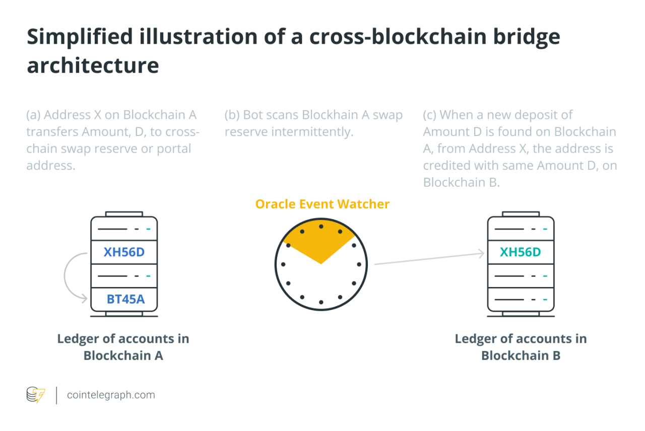 审查一些现有的桥接实施可以帮助了解跨链资产转移标准可能需要什么。 这些桥接主要利用公私钥哈希方法的非冲突特性,使区块链资产能够跨越使用类似地址生成算法的链。 这只是意味着,如果用户拥有可以访问区块链上地址的私钥,则该用户将能够使用相同的密钥解锁和访问另一个使用相同私有-公共关系的区块链上的相同地址。密钥散列方法。 该技术已被用于生成桥以将 Ether 传输到使用类似地址系统的其他网络,例如 币安智能链、Avalanche C-Chain 或 Toronet 链。 一个去中心化的预言机系统监控区块链,当价值从一个地址转移到某个指定的出口或门户地址(或智能合约)时,预言机将资产转移到另一条链上的相同地址,同时知道链上的所有者第一条链也将拥有访问另一条链上相同地址和资产的密钥。 这如下图所示。