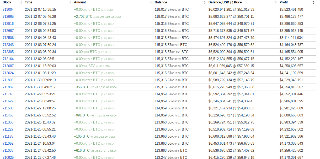 该账户在推特上写道:“这是该钱包中官方持有的比特币数量最高的:118,017 BTC,鲸鱼总共投入了 2.5B 美元以每个 BTC 的平均成本为 21,160 美元购买 BTC。”