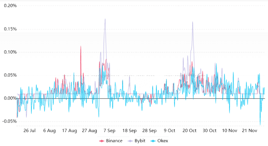 中性市场倾向于显示 0% 到 0.03% 的正资金利率,相当于每周 0.6%。 这表明多头是支付者,数据显示散户交易员自 11 月 4 日以来大多保持中立,最后一次突破 0.07% 发生在 10 月 21 日。